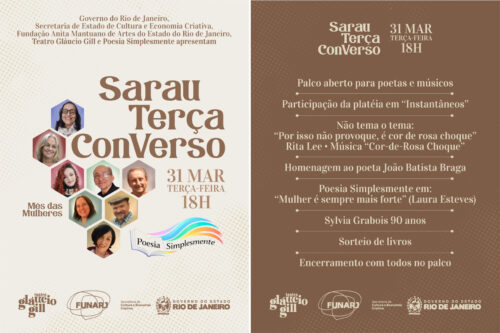 – DIA 31 DE MARÇO, A PARTIR DAS 18h, “POESIA SIMPLESMENTE – SARAU TERÇA CONVERSO”, com palco aberto para poetas e músicos. Homenagem ao poeta JOÃO BATISTA BRAGA; aniversário de 90 anos da nossa querida SYLVIA GRABOIS; sorteio de livros e apresentação do grupo homenageando a grande LAURA ESTEVES. Tudo no card. Local: Teatro Glaucio Gill, Praça Cardeal Arcoverde, s/n, Copacabana. R$ 10,00. IMPERDÍVEL!!!