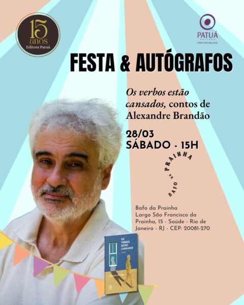 – AMANHÃ, 28 DE MARÇO, ÀS 15h, “OS VERBOS ESTÃO CANSADOS”, de ALEXANDRE BRANDÃO. Dia de festa e autógrafos. Local: Bafo da Prainha, Largo São Francisco da Prainha, 15, Saúde. QUEM AINDA NÃO LEU, NÃO PERCA ESSE SENSACIONAL LIVRO DE CONTOS!