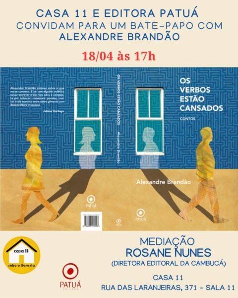 – DIA 18 DE ABRIL, ÀS 17h, bate-papo com ALEXANDRE BRANDÃO sobre seu livro “OS VERBOS ESTÃO CANSADOS”. Mediação: ROSANE NUNES. Local: Casa 11, Rua das Laranjeiras, 371, sala 11.