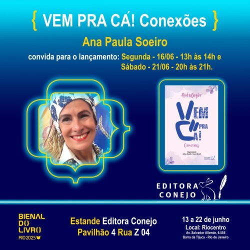 – DAS 20h às 21h, LANÇAMENTO DA ANTOLOGIA “VEM PRA CÁ! CONEXÕES” (Ed. Conejo), com, entre outros poetas, ANA PAULA SOEIRO e LÍLIAN MAIAL. Local: Estande Editora Conejo, Pavilhão 4, Rua Z 04.