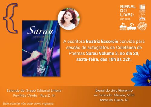 – DAS 18h ÀS 22h, LANÇAMENTO DA COLETÂNEA “SARAU VOLUME 3”, com a grande poeta BEATRIZ ESCORCIO. Local: Estande do Grupo Editorial Litteris, Pavilhão Verde, Rua Z, 14.
