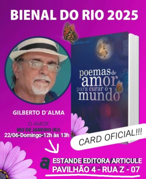 – DAS 12h às 13h, LANÇAMENTO DA ANTOLOGIA “POEMAS DE AMOR PARA CURAR O MUNDO”, com, entre outros, GILBERTO D’ALMA. Local: Estande Editora Articule, Pavilhão 4, Rua Z – 07