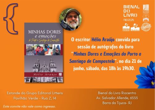 – DAS 18h ÀS 19h30, LANÇAMENTO DE “MINHAS DORES E EMOÇÕES DO PORTO A SANTIAGO DE COMPOSTELA”, do grande jornalista HÉLIO ARAUJO. Local: Estande do Grupo Editorial Litteris, Bienal do Livro do RJ, Pavilhão Verde, Rua Z – 14, Riocentro. IMPERDÍVEL!