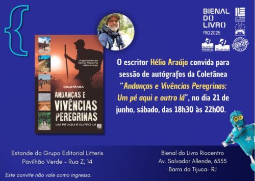– DAS 18h30 às 22h, LANÇAMENTO DE “ANDANÇAS E VIVÊNCIAS PEREGRINAS: UM PÉ AQUI E OUTRO LÁ”, organização de HÉLIO ARAUJO, que, também, é um dos autores da coletânea. Local: Estande do Grupo Editorial Litteris, Bienal do Livro do RJ, Pavilhão Verde, Rua Z – 14, Riocentro.