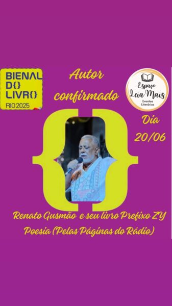–  LANÇAMENTO DE “PREFIXO ZY POESIA (PELAS PÁGINAS DO RÁDIO”, do poeta e querido amigo RENATO GUSMÃO, com direito ao “Recital BIOMA AMAZÔNICO”. Local: Bienal do Livro: Espaço Leia Mais – Eventos Literários.