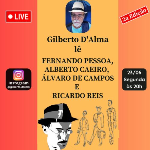 – DIA 23 DE JUNHO, ÀS 20h, LIVE “GILBERTO D’ALMA LÊ FERNANDO PESSOA, ALBERTO CAEIRO, ÁLVARO DE CAMPOS e RICARDO REIS”. Local: Instagram@gilberto.dalma