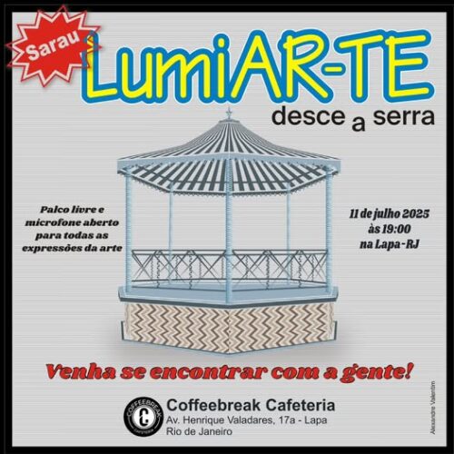– DIA 11 DE JULHO, ÀS 19h, “LUMIARTE DESCE A SERRA”, que acontece em Lumiar e São Pedro da Serra, anualmente, vem pela primeira vez ao Rio. O evento, de 11 anos de sucesso, abarca literatura, música, dança, cinema, fotografia, artes plásticas etc. PALCO LIVRE e MICROFONE ABERTO! Local: Coffeebreak Cafeteria, Av. Henrique Valadares, 17ª, Lapa. SENSACIONAL!
