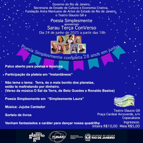 – DIA 24 DE JUNHO, A PARTIR DAS 18h, “SARAU TERÇA CONVERSO”, com o GRUPO POESIA SIMPLESMENTE que apresenta “SIMPLESMENTE LAURA”. Poesia, música, teatro, sorteios e dança de quadrilha. MAIORES DETALHES NO POSTER. Local: Teatro Glaucio Gill, Praça Cardeal Arcoverde, s/n, Copacabana. R$ 10,00 e R$ 5,00.