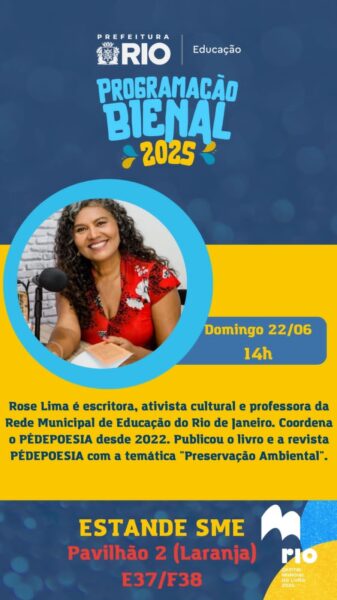 – ÀS 14h, LANÇAMENTO DE “PÉDEPOESIA” (livro e revista virtual, com vários autores), com a temática “Preservação Ambiental”, organização e palestra de ROSE LIMA. Local: Estande SME, Pavilhão 2 (laranja) E37/F38. BIENAL 2025.