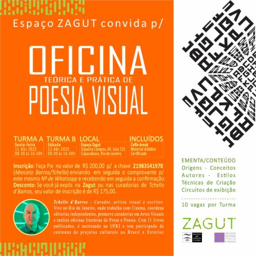 – DIAS 11 de abril e 12 de abril, das 08:30 às 16:30h, ESPAÇO ZAGUT convida para “OFICINA TEÓRICA E PRÁTICA DE POESIA VISUAL”, com o poeta TCHELLO D BARROS. Turmas de 10 alunos, incluindo Coffe-break, material didático e certificado. R$ 200,00. Local: Espaço Zagut, Rua Siqueira Campos, 43, sala 725, Copacabana. Inscrições: 21-98354-1978, ZAP.