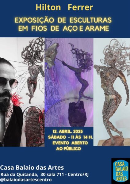– AMANHÃ, DIA 12 DE ABRIL, DAS 11h às 14h, “HILTON FERRER”, exposição de esculturas em fios de aço e arame. Local: Casa Balaio das Artes, rua da Quitanda, 30, sala 711, Centro. Aberto ao público.