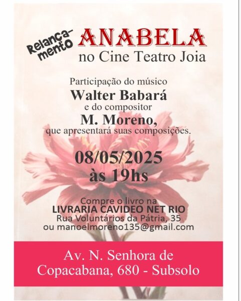 – DIA 08 DE MAIO, ÀS 19h, “ANABELA”, de MANOEL MORENO, com participações do músico WALTER BABARÁ e do compositor e autor do livro. Local: Cine Teatro Joia, Av. N. Senhora de Copacabana, 680, subsolo.
