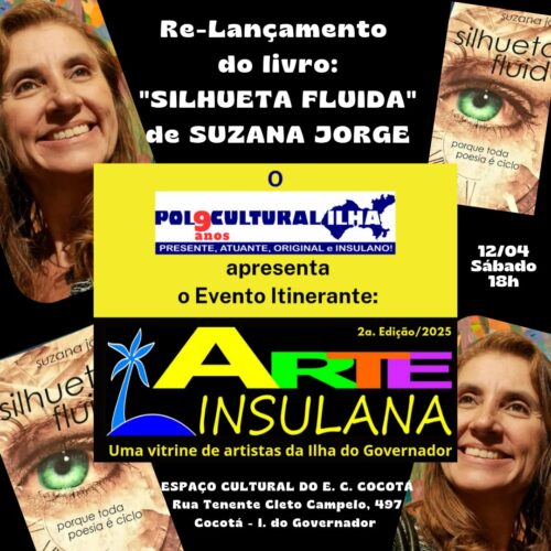 – AMANHÃ, DIA 12 DE ABRIL, DAS 18h ÀS 21H, “SILHUETA FLUIDA”, de SUZANA JORGE, dentro do evento “Arte Insulana”, com diversos convidados insulanos, como o organizador GILBERTO D’ALMA. Local: Espaço Cultural do E.C.Cocotá, Rua Tenente Cleto Campeto, 497, Cocotá, Ilha do Governador.
