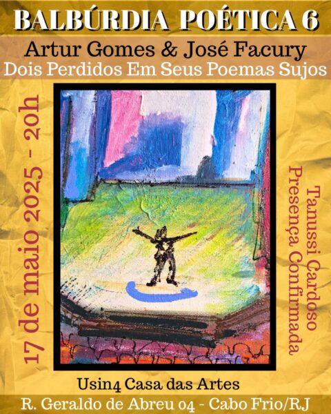 – DIA 17 DE MAIO, ÀS 20h, “BALBÚRDIA POÉTICA 6”, com ARTUR GOMES & JOSÉ FACURY (Dois Perdidos em seus Poemas Sujos), com a participação de JIDDDU SALDANHA e TANUSSI CARDOSO. Local: Usin4 Casa das Artes, Rua Geraldo de Abreu 04, Cabo Frio.