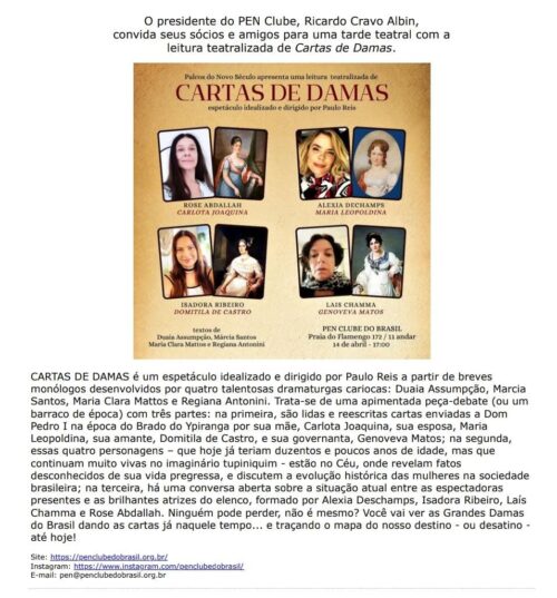 – DIA 14 de ABRIL, ÀS 17h, “CARTAS DE DAMAS”, dirigido por PAULO REIS, com ROSE ABDALLAH (Carlota Joaquina), ALEXIA DECHAMPS (Maria Leopoldina), ISADORA RIBEIRO (Domitila de Castro) e LAIS CHAMMA (Genoveva Matos). Textos de DUAIA ASSUMPÇÃO, MÁRCIA SANTOS, MARIA CLARA MATTOS e REGINA ANTONINI. Local: PEN Clube do Brasil, Praia do Flamengo, 172/ 11º andar.