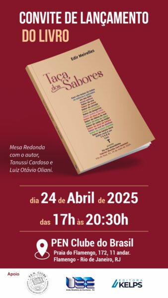– DIA 24 de ABRIL, DAS 17h às 20:30h, “TAÇA DOS SABORES”, de EDIR MEIRELLES. Mesa redonda com LUIZ OTÁVIO OLIANI e TANUSSI CARDOSO. Local: PEN Clube do Brasil, Praia do Flamengo, 172, 11 andar, Flamengo.