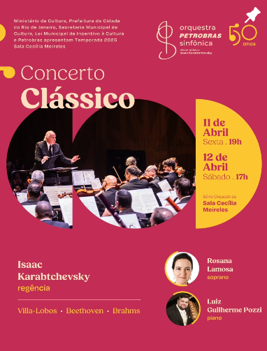 – HOJE, DIA 11 DE ABRIL, E AMANHÃ, DIA 12 DE ABRIL, ORQUESTRA PETROBRAS SINFÔNICA, sob a regência de ISAAC KARABTCHEVSKY, interpretando VILLA-LOBOS, BRAHMS e BEETHOVEN. Local: Sala Cecília Meireles, Lapa. Sexta, às 19h; sábado, às 17h.