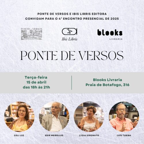 – DIA 15 de abril, DAS 18H ÀS 21h, “PONTE DE VERSOS”, com CELI LUZ, EDIR MEIRELLES, LYDIA SIMONATO e LUIS TURIBA. Local: Blooks Livraria, Praia de Botafogo, 316.