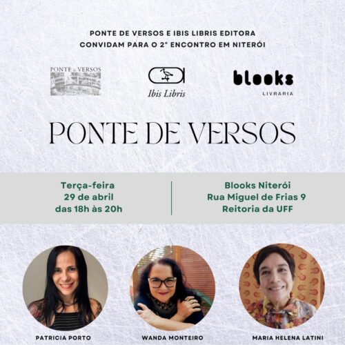 – DIA 29 de abril, das 18h às 20h, “PONTE DE VERSOS”, com PATRICIA PORTO, WANDA MONTEIRO e MARIA HELENA LATINI. Local: Blooks Niterói, Rua Miguel de Frias, 9, Reitoria da UFF.