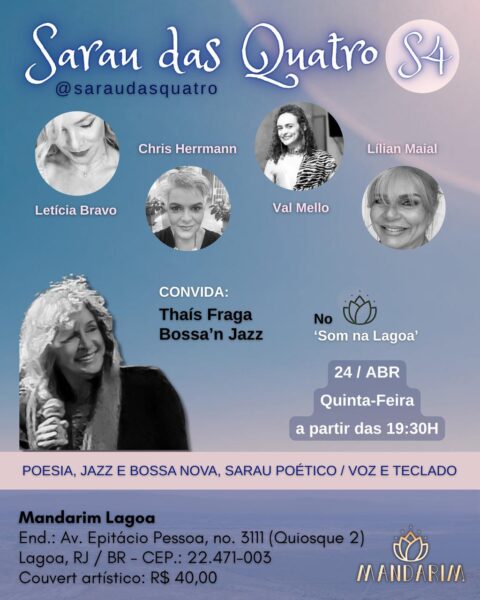 – DIA 24 DE ABRIL, A PARTIR DAS 19h30, “SARAU DAS QUATRO S4”, com CRIS HERRMANN, LETÍCIA BRAVO, LILIAN MAIAL e VAL MELLO, e a presença de THAÍS FRAGA BOSSA’N JAZZ. Local: Mandarim Lagoa, Av. Epitácio Pessoa, 3111A (Quiosque 2).