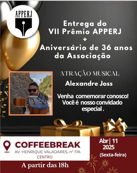 – HOJE, DIA 11 DE ABRIL, A PARTIR DAS 18H, “ENTREGA DO VII PRÊMIO APPERJ / e ANIVERSÁRIO DE 36 ANOS DA ASSOCIAÇÃO”, com a atração musical de ALEXANDRE JOSS. Local: Coffeebreak, Av. Henrique Valadares, 17ª, Centro.