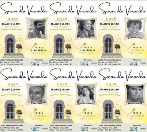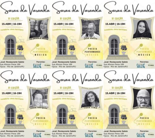– DIA 15 DE ABRIL, DAS 16h às 19h, “SARAU DA VARANDA”, curadoria de CHRIS HERRMANN, com MARIA DO CARMO BOMFIM, ALEXANDRE GUARNIERI, AMALRI NASCIMENTO, ANGELA WAINS, ANNA MARIA FERNANDES, CHRIS HERRMAN, DEI RIBAS, GRINGO CARIOCA, LILIAN MAIAL, NUNO RAU, RENATA QUIROGA, ROZZI BRASIL e VAL MELLO, entre outros. Local: Restaurante Salete, Rua Afonso Pena, 189, Tijuca.