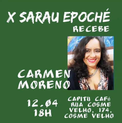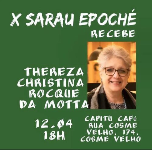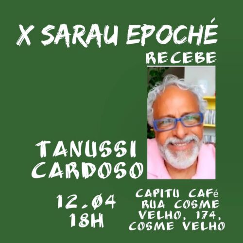 – AMANHÃ, DIA 12 DE ABRIL, às 18h, “X SARAU EPOCHÉ”, com, entre outros, CARMEN MORENO, TANUSSI CARDOSO e THEREZA CHRISTINA ROCQUE DA MOTTA. Organização e apresentação de IGOR CALAZANS. Local: Capitu Café, Rua Cosme Velho, 174, Cosme Velho.