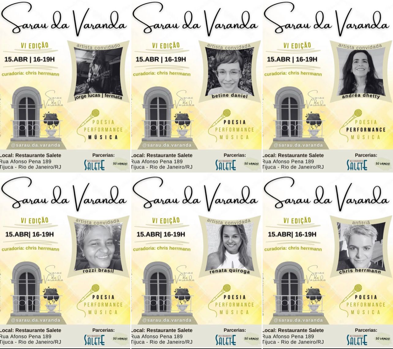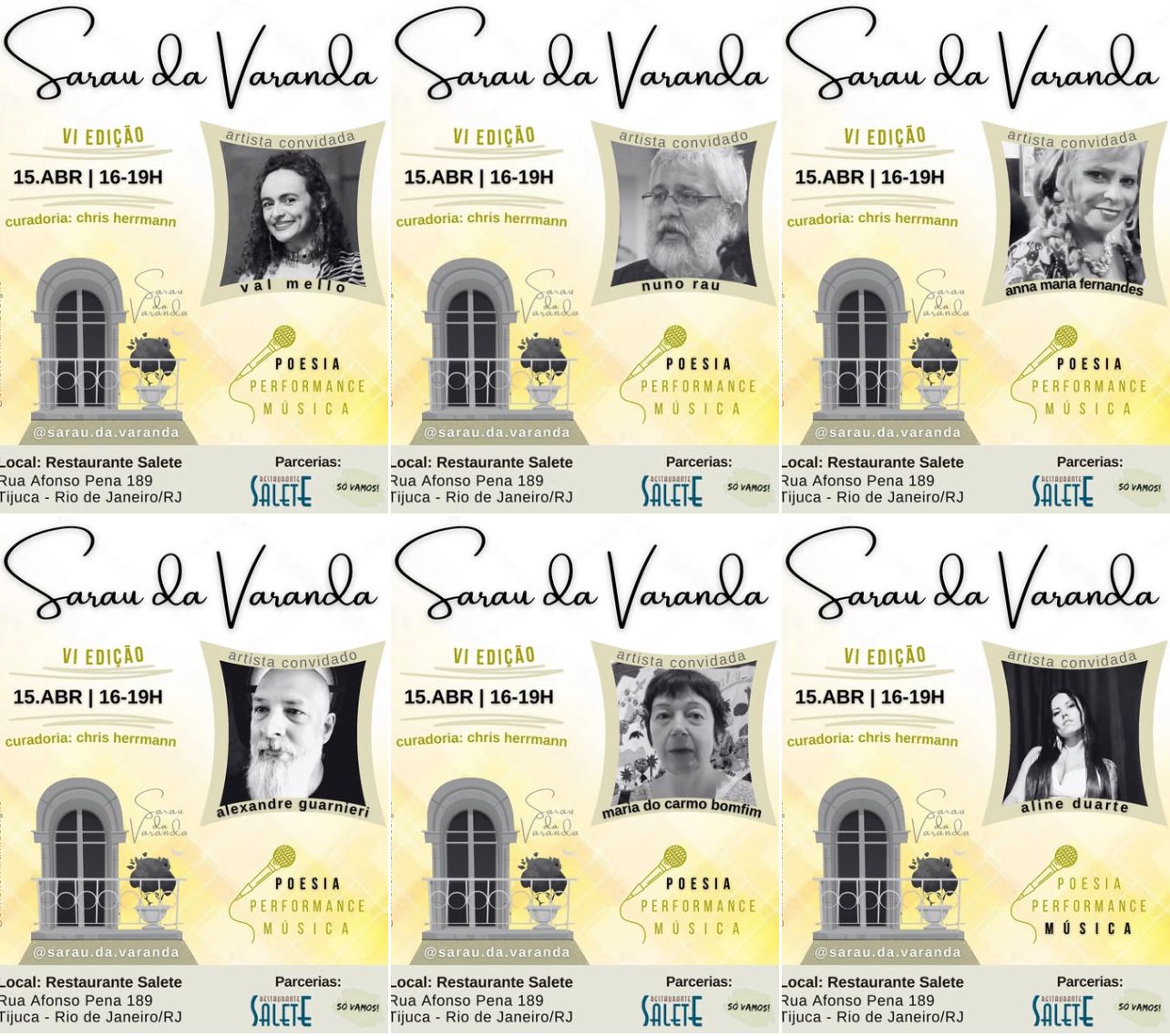 – DIA 15 DE ABRIL, DAS 16h às 19h, “SARAU DA VARANDA”, curadoria de CHRIS HERRMANN, com MARIA DO CARMO BOMFIM, ALEXANDRE GUARNIERI, AMALRI NASCIMENTO, ANGELA WAINS, ANNA MARIA FERNANDES, CHRIS HERRMAN, DEI RIBAS, GRINGO CARIOCA, LILIAN MAIAL, NUNO RAU, RENATA QUIROGA, ROZZI BRASIL e VAL MELLO, entre outros. Local: Restaurante Salete, Rua Afonso Pena, 189, Tijuca.