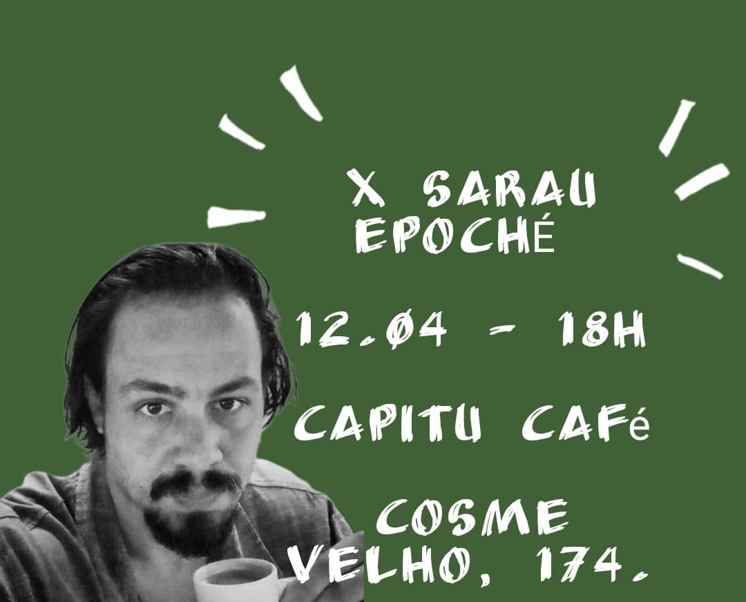 – AMANHÃ, DIA 12 DE ABRIL, às 18h, “X SARAU EPOCHÉ”, com, entre outros, CARMEN MORENO, TANUSSI CARDOSO e THEREZA CHRISTINA ROCQUE DA MOTTA. Organização e apresentação de IGOR CALAZANS. Local: Capitu Café, Rua Cosme Velho, 174, Cosme Velho.