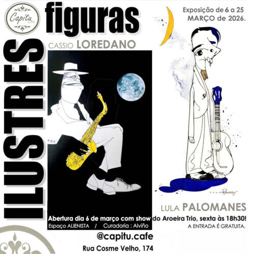 – ATÉ 25 DE MARÇO, “FIGURAS ILUSTRES – CARICATURAS DE LOREDANO E LULA”. Curadoria: ALVIÑO, com obras dos caricaturistas CÁSSIO LOREDANO e LULA PALOMANES. Local: Capitu Café, Rua Cosme Velho, 174. Segunda a sábado, das 7h ÀS 21h30; domingo, das 8h às 20h30. HOJE, DIA 06, SEXTA, será a ABERTURA, e haverá show do AROEIRA TRIO, ÀS 18h30.