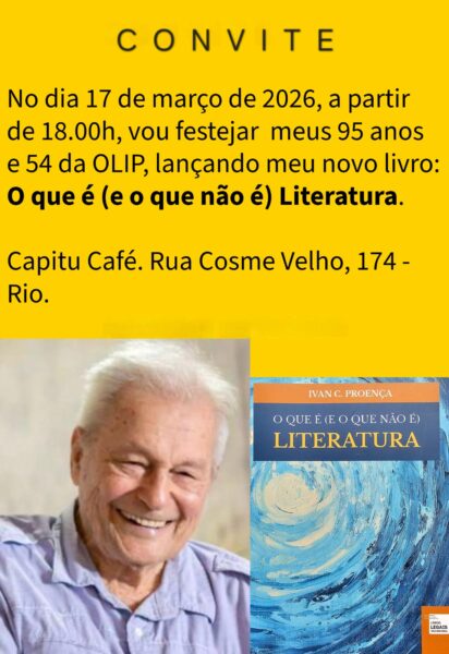 – DIA 17 DE MARÇO, A PARTIR DAS 18h, “O QUE É (E O QUE NÃO É) LITERATURA, do Mestre IVAN C. PROENÇA, festejando seus 95 anos e 54 da OLIP. Local: Capitu Café, Rua Cosme Velho, 174. IMPERDÍVEL!!!