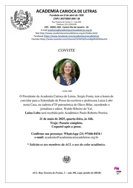 – DIA 21 DE MAIO, ÀS 16h, a Academia Carioca de Letras convida para a solenidade de posse da escritora e professora LUIZA LOBO, que será recebida pelo acadêmico PAULO ROBERTO PEREIRA. Local: ACL: Rua Teixeira de Freitas, 5, sala 306, Lapa, prédio do IHGB. Traje: passeio completo. Com coquetel.