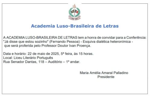– DIA 22 DE MAIO, ÀS 15h, a Academia Luso-Brasileira convida para a conferência “JÁ DISSE QUE ESTOU SOZINHO” (FERNANDO PESSOA) – Esquiva dialética heteronímica,” proferida pelo professor Doutor IVAN PROENÇA. Local: Liceu Literário Português – Rua Senador Dantas, 118 – Auditório – 1º andar.