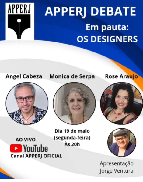 – DIA 19 DE MAIO, ÀS 20h, “APPERJ DEBATE: OS DESIGNERS”, com ANGEL CABEZA, MONICA DE SERPA e ROSE ARAUJO. Apresentação: JORGE VENTURA. Local: YouTube: Canal APPERJ OFICIAL.