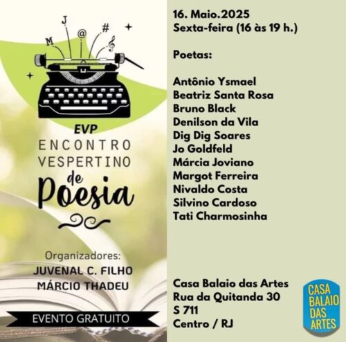 – HOJE, DIA 16 DE MAIO, DAS 16h ÀS 19h, “EVP – ENCONTRO VESPERTINO DE POESIA”, organização de JUVENAL C. FILHO e MÁRCIO THADEU, com BRUNO BLACK, entre outros artistas e poetas. Local: Casa Balaio das Artes. Rua da Quitanda, 30 S/ 711, Centro. Evento gratuito.