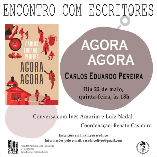 – DIA 22 DE MAIO, ÀS 18h, “ENCONTRO COM ESCRITORES”, coordenação de RENATO CASIMIRO, receberá o escritor CARLOS EDUARDO PEREIRA, numa conversa com INÊS AMORIM e LUIZ NADAL sobre o romance do autor “AGORA AGORA”, Todavia, 2022. Local: Casa Dirce. Rua das Palmeiras, 82, Botafogo.