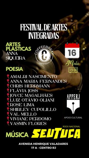 – HOJE, DIA 16 DE MAIO, ÀS 19h, “FESTIVAL DE ARTES INTEGRADAS”, com, entre outros: AMALRI NASCIMENTO, ANNA MARIA FERNANDES, CHRIS HERRMANN, LUIZ OTÁVIO OLIANI, ROSE LIMA e VAL MELLO. Artes Plásticas: ANNA SIQUEIRA; Música: Seu Tuca. Local: Av. Henrique Valadares 17ª, Centro.