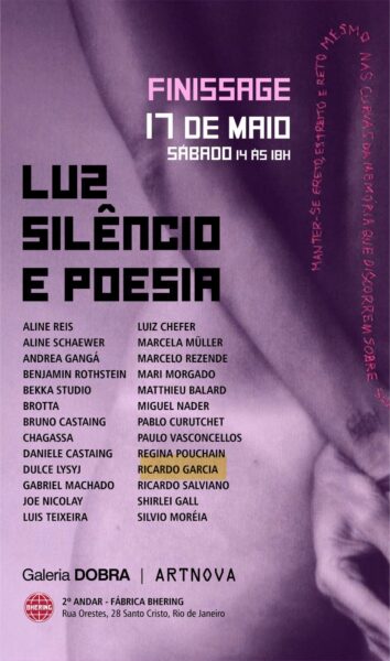 – AMANHÃ, SÁBADO, 17 DE MAIO, DAS 14h ÀS 18h, “LUZ SILÊNCIO E POESIA”, entre os diversos expositores, destacamos REGINA POUCHAIN e RICARDO GARCIA. Local: Galeria Dobra / |RTNVA. Fábrica Bhering – 2º andar. Rua Orestes, 28, Santo Cristo.