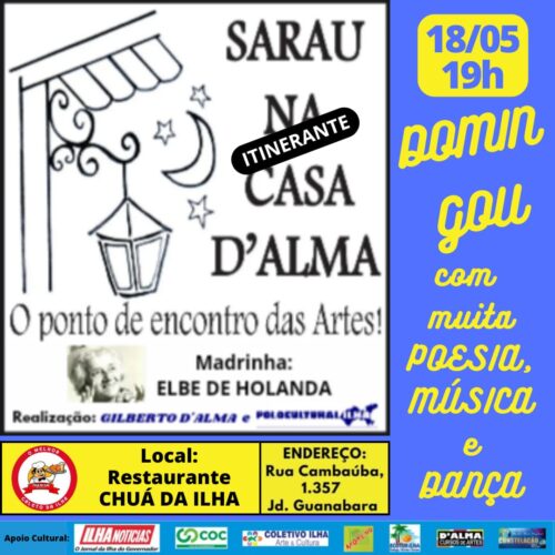 – DIA 18 DE MAIO, ÀS 19h, “SARAU NA CASA D’ALMA”, com poesia, música e dança. Realização: GILBERTO D’ALMA. Local: Restaurante Chuá da Ilha. Rua Cambaúba, 1357, Jardim Guanabara.