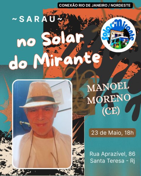 – DIA 23 DE MAIO, ÀS 18h, “CONEXÃO RIO DE JANEIRO / NORDESTE – SARAU NO SOLAR DO MIRANTE”, com o cearense MANOEL MORENO. Local: Rua Aprazível, 86, Santa Teresa.