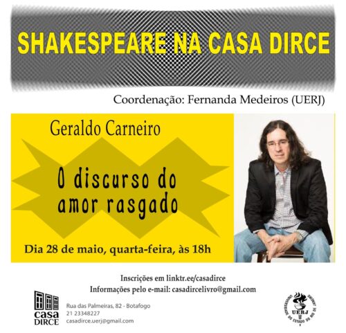 – DIA 28 DE MAIO, ÀS 18h, “SHAKESPEARE NA CASA DIRCE”, com o poeta, roteirista, dramaturgo e membro da ABL, GERALDO CARNEIRO conversando sobre “SHAKESPEARE: O DISCURSO DO AMOR RASGADO”. Coordenação: FERNANDA MEDEIROS (UERJ). Local: Casa Dirce. Rua das Palmeiras, 82, Botafogo.