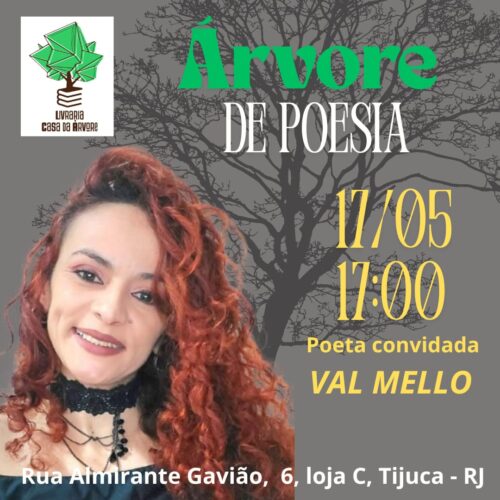 – AMANHÃ, DIA 17 DE MAIO, ÀS 17h, “ÁRVORE DE POESIA”, com dois dos mais queridos poetas do Rio de Janeiro: JORGE VENTURA e VAL MELLO. Local: Rua Almirante Gavião, 6, loja C, Tijuca. IMPERDÍVEL!