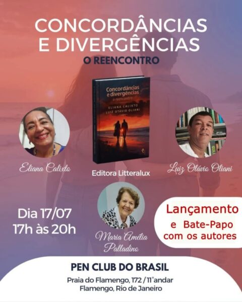 DIA 17 DE JULHO, ÀS 20h, “CONCORDÂNCIAS E DIVERGÊNCIAS – O REENCONTRO” (Editora Litteralux), de ELIANA CALIXTO e LUIZ OTÁVIO OLIANI, com direito a bate-papo com os autores e MARIA AMÉLIA PALLADINO. Local: Pen Clube do Brasil, Praia do Flamengo, 172/11º andar, Flamengo.