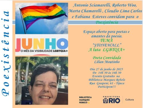 – HOJE, DIA 27 DE JUNHO, DAS 14h30 ÀS 16h30, “POEXISTÊNCIA”, organização de ANTONIO SCIAMARELLI, ROBERTO WOO, MARTA CHIAMARELLI, CLAUDIO LIMA CARLOS e FABIANA ESTEVES. Tema: “STONEWALL” – A LUTA LGBTQIA+”. Poeta convidada: LILIAN MOUTINHO. Espaço aberto. Local: Biblioteca Marques Rebelo, Rua Guapeni, 61, Tijuca.