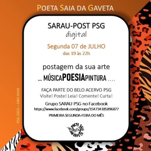 DIA 07 DE JULHO, DAS 19h ÀS 22h, não deixe de enviar sua música, poesia ou pintura para o POETA SAIA DA GAVETA – SARAU-POST PSG DIGITAL. LEIAM DETALHES NO POSTER.