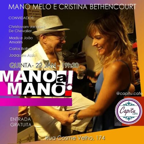 – DIA 22 DE JANEIRO, ÀS 19h30, “MANO A MANO”, com MANO MELO e CRISTINA BETHENCOURT. Convidados: CHRISTOVAM JACQUES DE CHEVALIER, MADU e JOÃO AMORIM, CARLOS BOLHA e JOAQUIM ASSIS. Local: Capitu Café, Rua Cosme Velho, 174. Entrada gratuita.