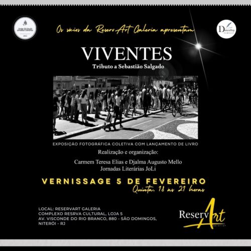 – DIA 05 DE FEVEREIRO, DAS 18h às 21h, “VIVENTES – TRIBUTO A SEBASTIÃO SALGADO”, exposição fotográfica coletiva com lançamento de livro. Organização: CARMEM TERESA ELIAS e DJALMA AUGUSTO MELLO. Local: Reservart Galeria, Complexo Reserva Cultural, loja 5, Av. Visconde do Rio Branco, 880, São Domingos, Niterói.
