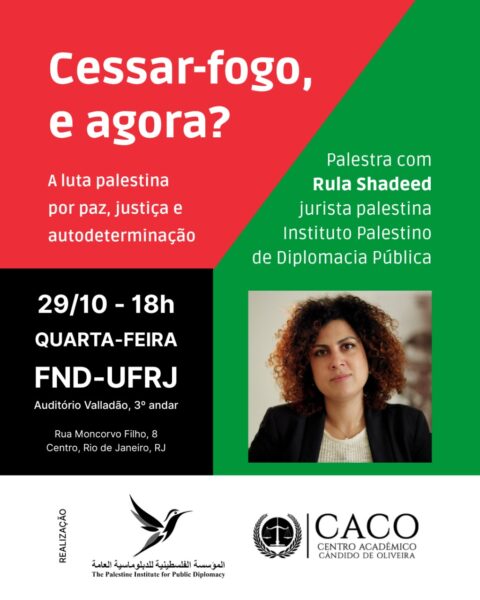 DIA 29 DE OUTUBRO, ÀS 18h, a palestra “CESSAR-FOGO, E AGORA? – A luta palestina por paz, justiça e autodeterminação”, com RULA SHADEED, jurista palestina do Instituto Palestino de Diplomacia Pública. Local: FND – UFRJ, Auditório Valadão, 3º andar, Rua Moncorvo Filho, 8, Centro.