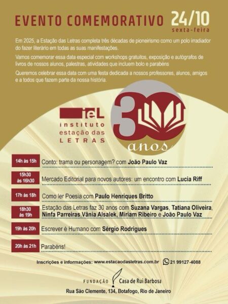 HOJE, DIA 24 DE OUTUBRO, DAS 14h ÀS 21h, a ESTAÇÃO DAS LETRAS (IEL) comemora 30 anos de atividades, com workshops, exposição, autógrafos, palestras. Grandes nomes: JOÃO PAULO VAZ, LUCIA RIFF, PAULO HENRIQUES BRITTO, SUZANA VARGAS, TATIANA OLIVEIRA, NINFA PARREIRAS, VÂNIA ALSALEK, MÍRIAM RIBEIRO e SÉRGIO RODRIGUES. PROGRAMAÇÃO COMPLETA NO POSTER. Local: Fundação Casa de Rui Barbosa.