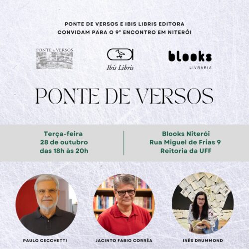 DIA 28 DE OUTUBRO, DAS 18h ÀS 20h, “PONTE DE VERSOS”, com PAULO CECCHETTI, JACINTO FÁBIO CORRÊA e INÊS DRUMMOND. Local: Blooks Niterói, Rua Miguel de Frias, 9, Reitoria da UFF.